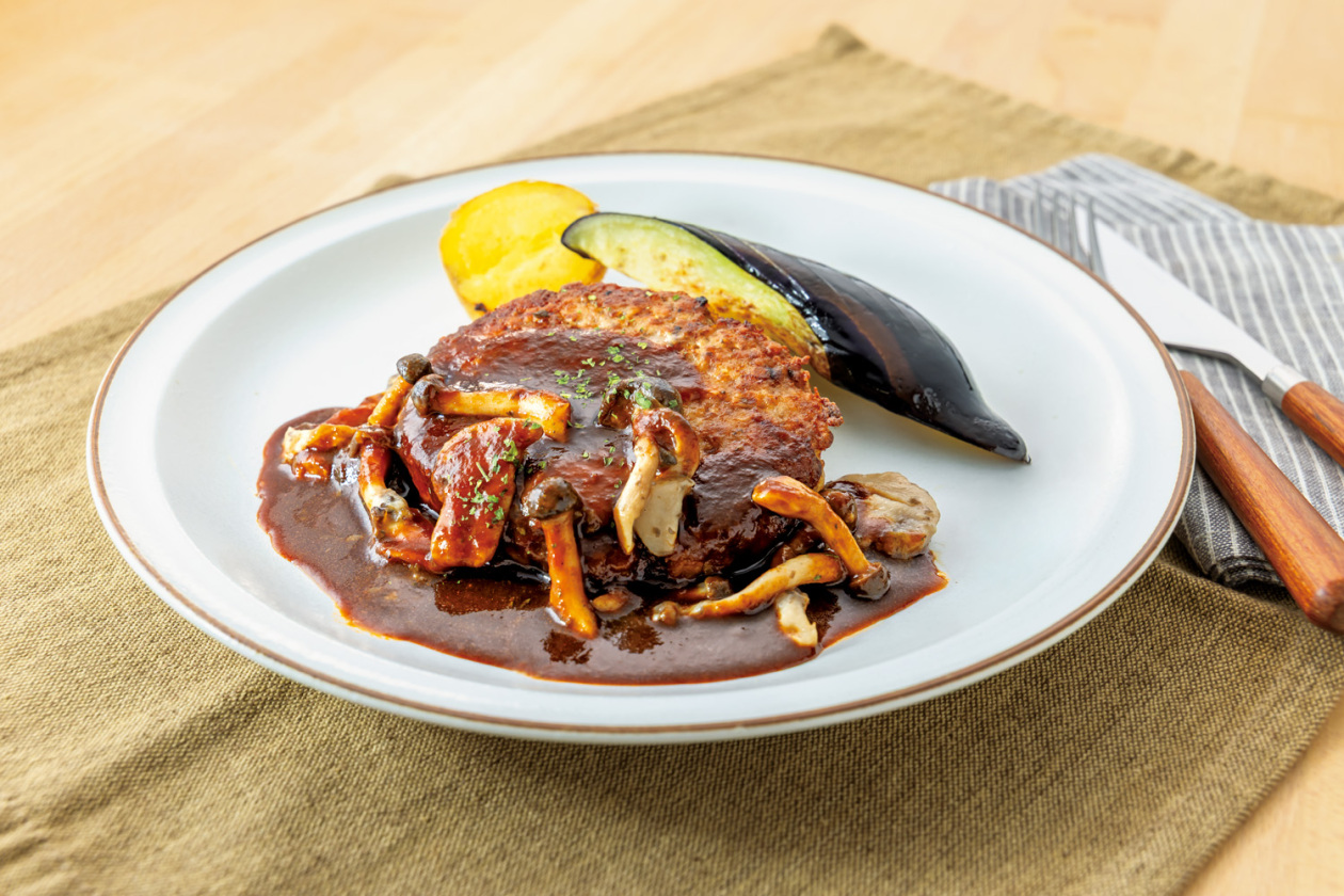 きのこを絡めた濃厚デミグラスソースのジューシーなハンバーグ。