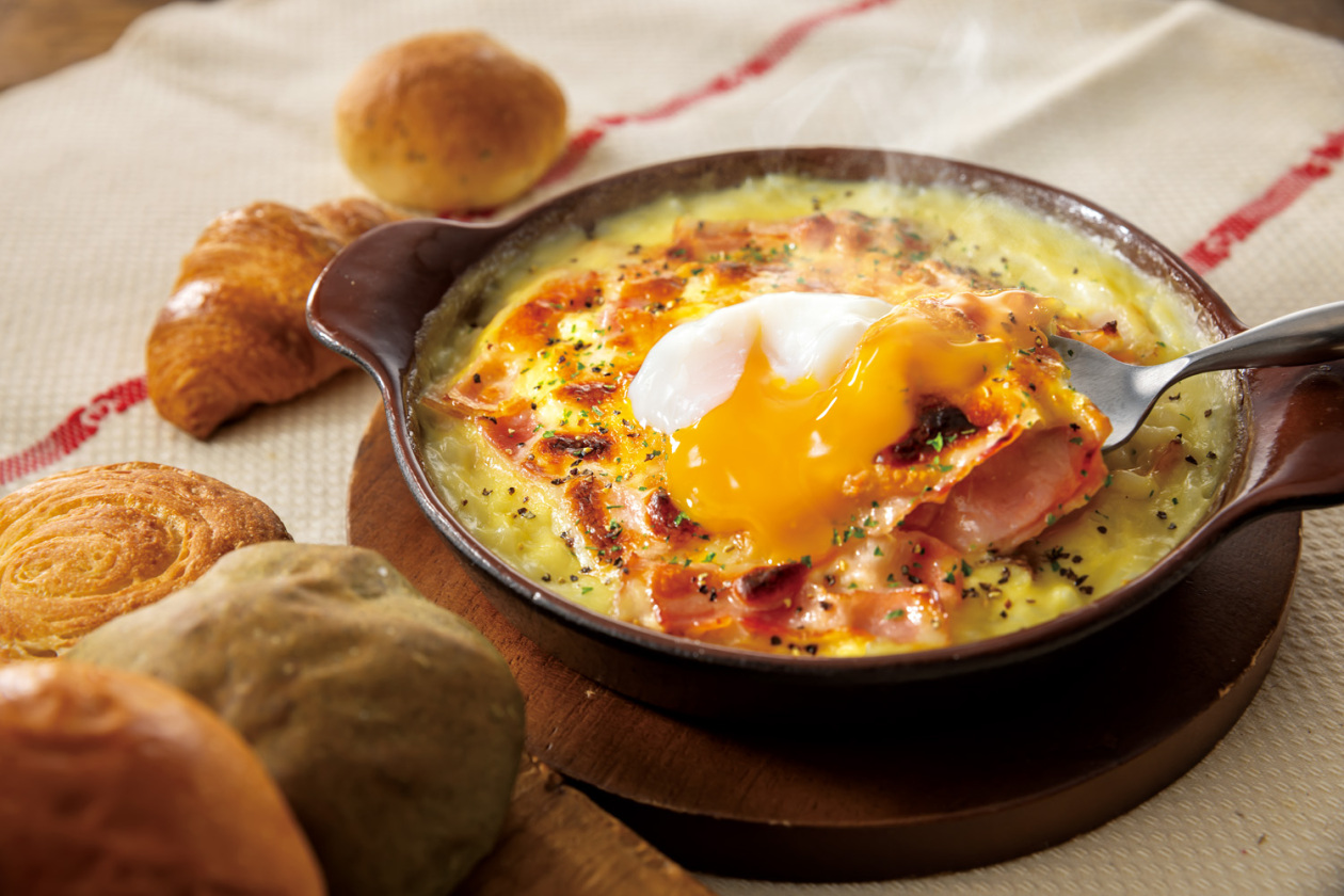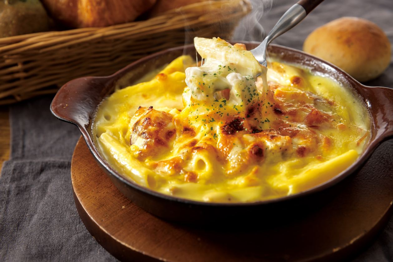 鶏もも肉とベーコンの旨味やコク、玉ねぎの甘さが詰まった王道グラタン。
