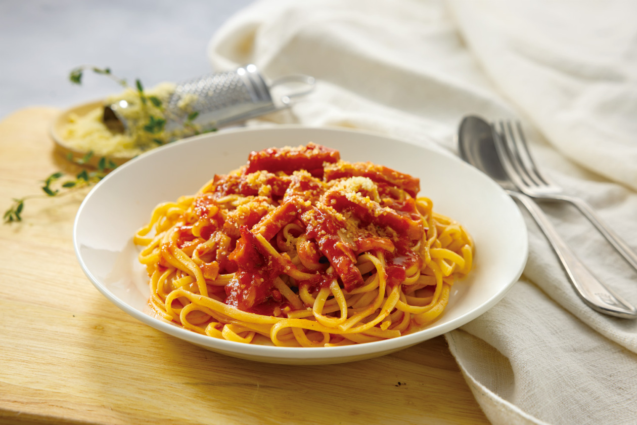 ベーコンの旨味たっぷりトマトソースとグリルしたなすは相性抜群。人気のトマトソースパスタ。