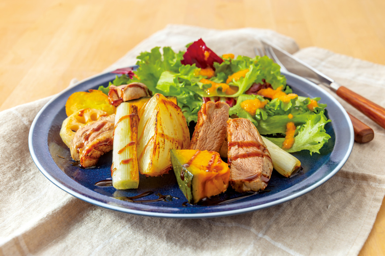 合鴨の旨味にグリル野菜の香ばしさを重ね、バルサミコの酸味がアクセントとなる一品。