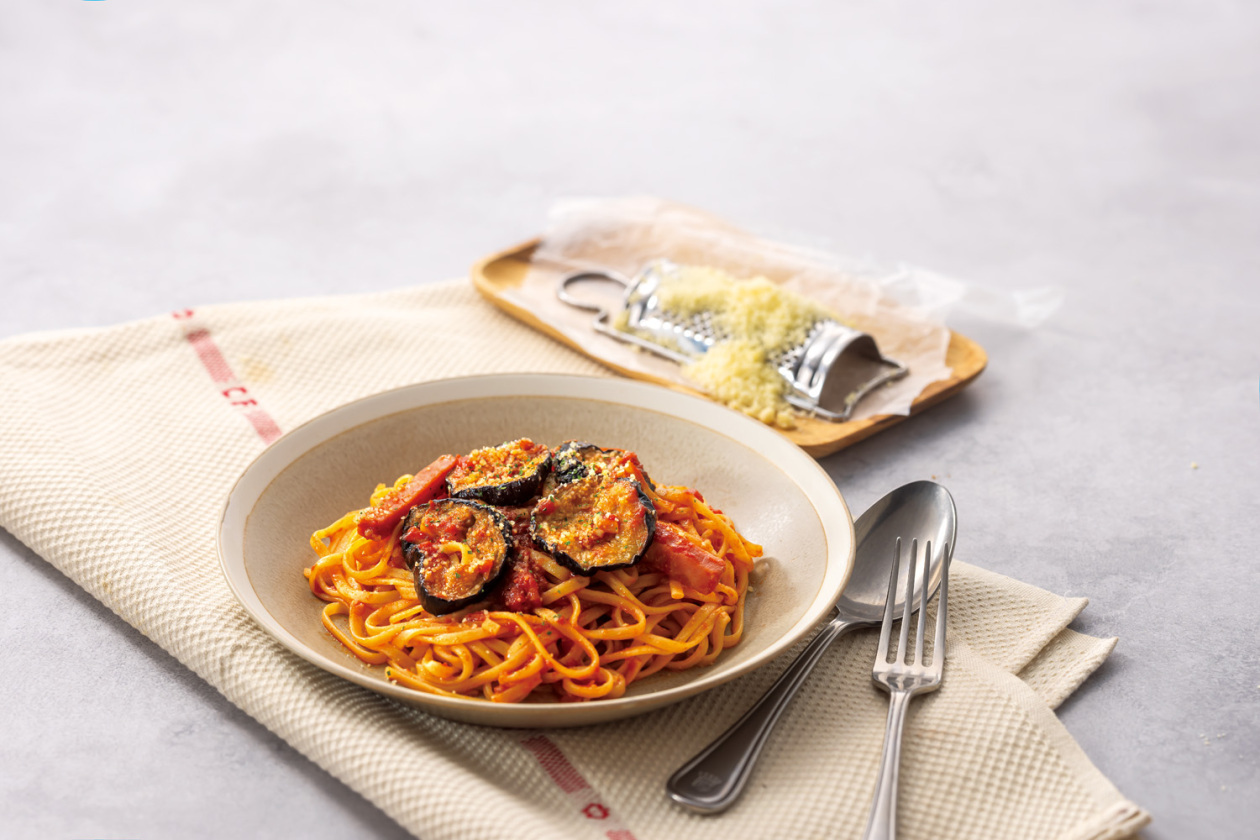グリルなすとベーコンのトマトソースパスタ