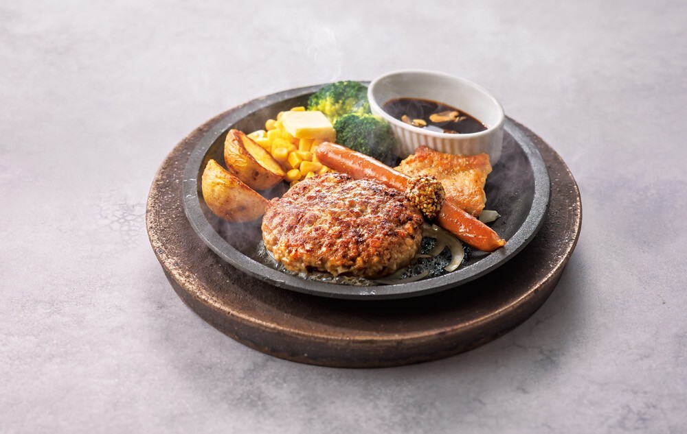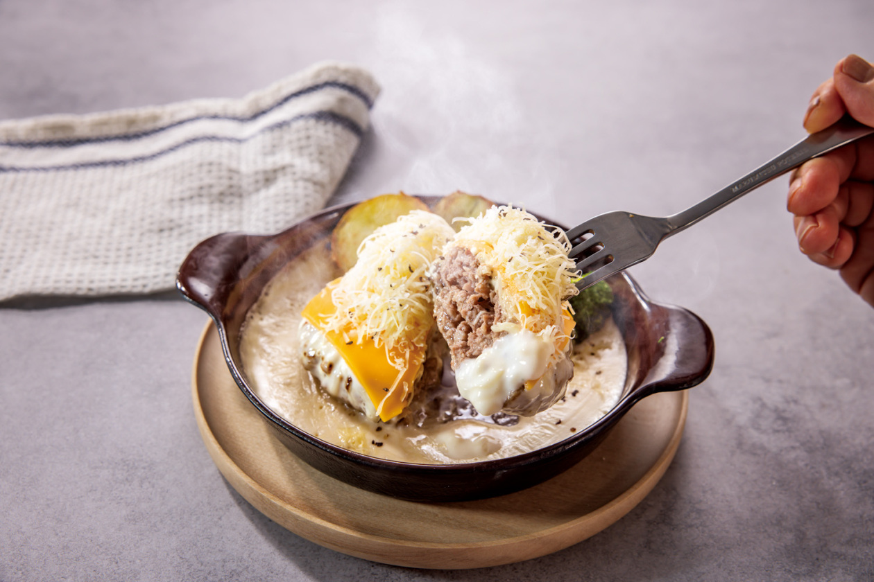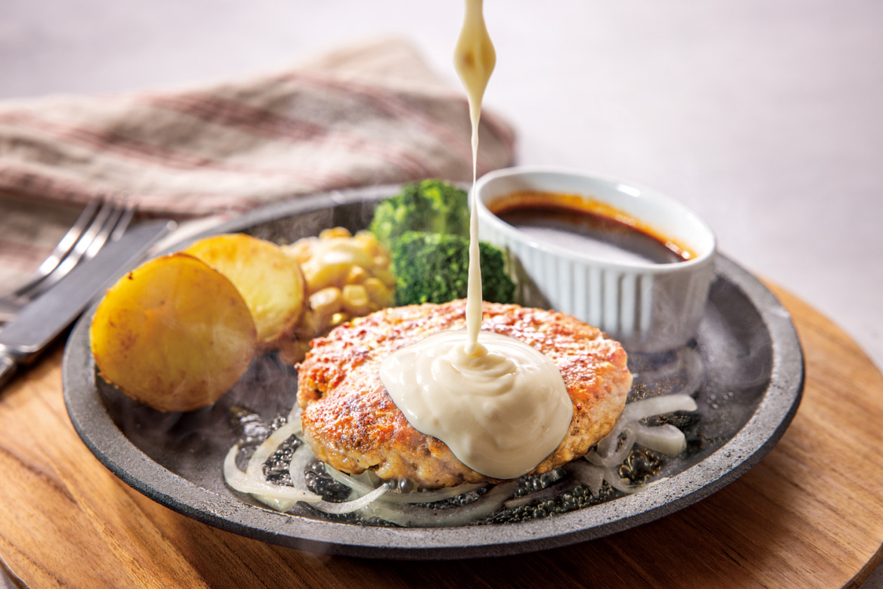 濃厚チーズソースだけ、デミグラスソースをプラスしてなど味の変化を楽しめるハンバーグ。