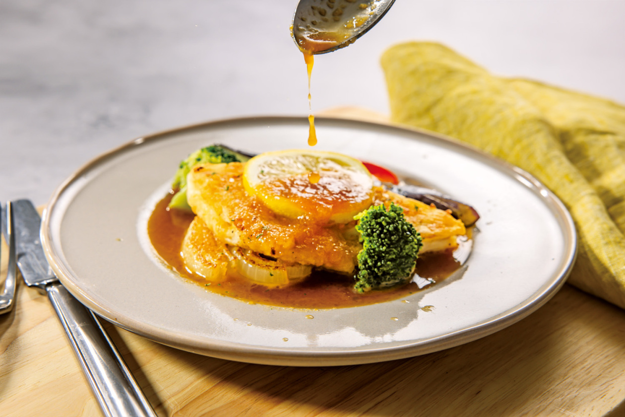 ふわっとした食感の白身魚とレモン風味の香ばしい焦がしバターソースがよく合います。