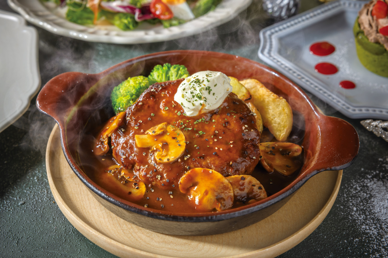 旨みあふれるハンバーグを濃厚クリームソースで。たっぷりのパルメザンチーズが旨みあふれるハンバーグが深いコクを引き立てます。