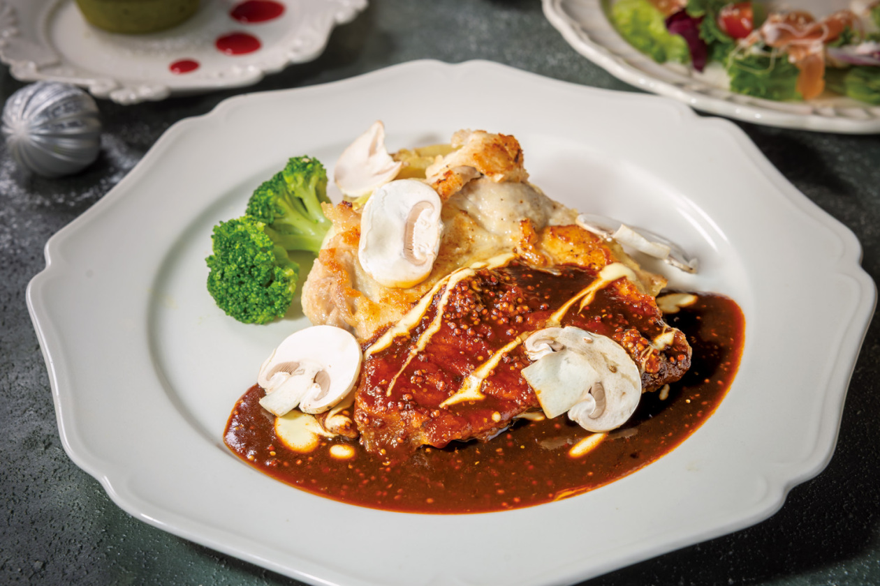 旨みあふれるハンバーグを濃厚クリームソースで。たっぷりのパルメザンチーズが旨みあふれるハンバーグが深いコクを引き立てます。