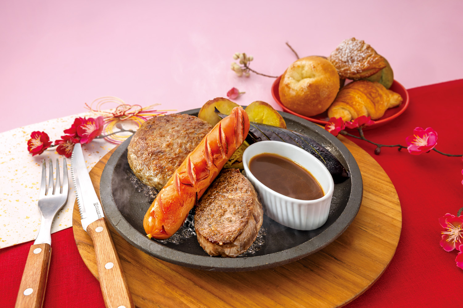 黒毛和牛ハンバーグ、デンマークソーセージ、ハンギングテンダーステーキを贅沢に盛り合わせ、香り豊かなトリュフソースで仕上げたプレミアム鉄板グリル。