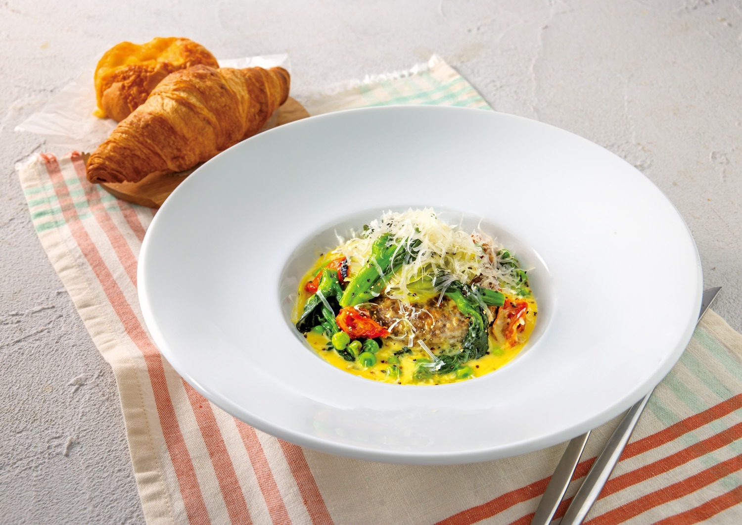 ・和牛バーグと春野菜のカルボナーラソース パン2個付き
