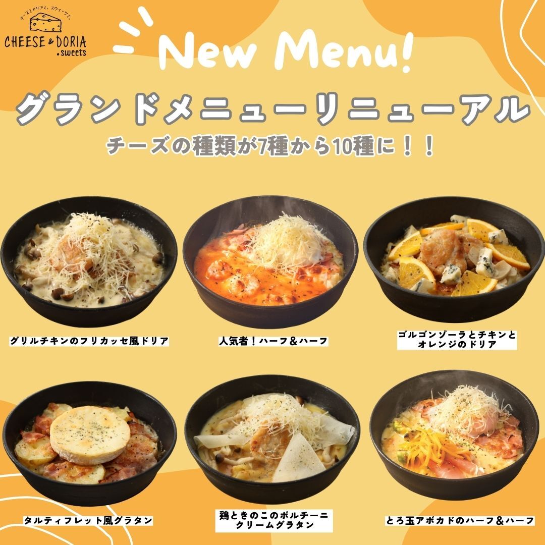 いつもチーズ&ドリア.スイーツをご利用いただきまして誠にありがとうございます。2025年11月13日(木)よりグランドメニューをリニューアルいたしました!人気メニューはそのままに、チーズたっぷりの贅沢…