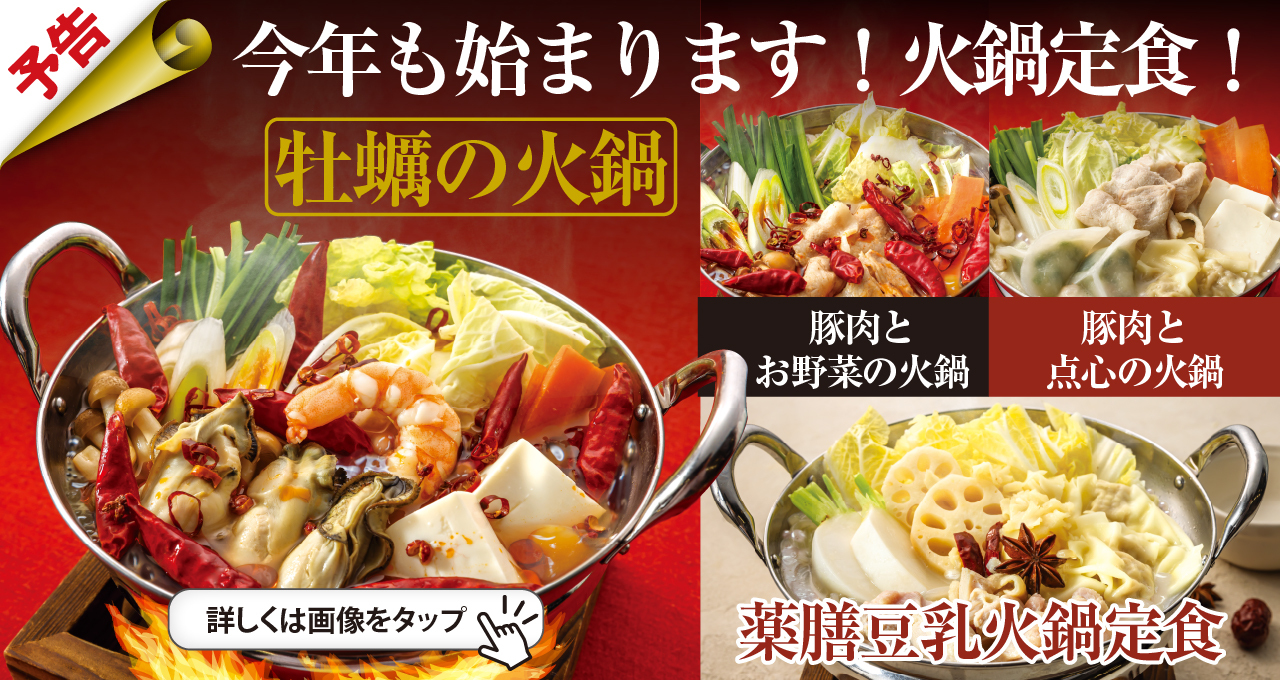 毎年ご好評の期間限定「火鍋定食」が12/1(月)より始まります!おひとり様用の火鍋に小籠包3個+白ごはんがセットになった冬限定メニューです。肌寒くなってきた季節に、ぜひ当店の火鍋で温まりくださいませ。…