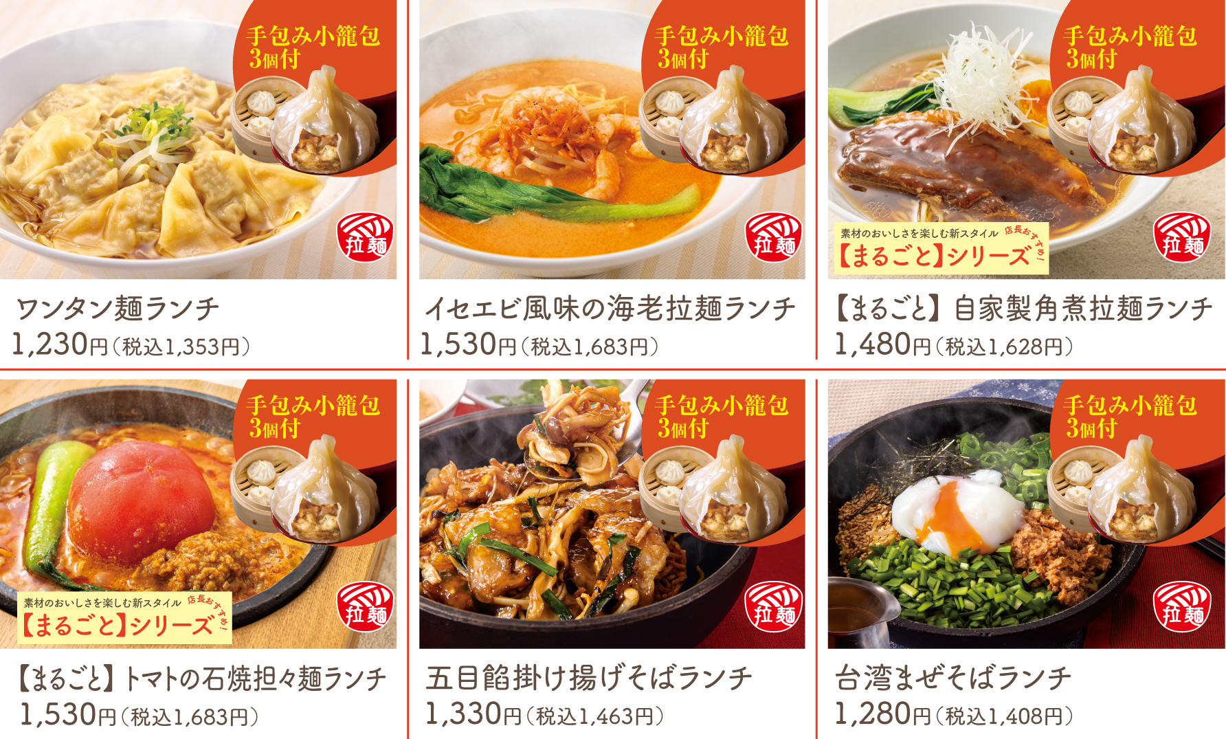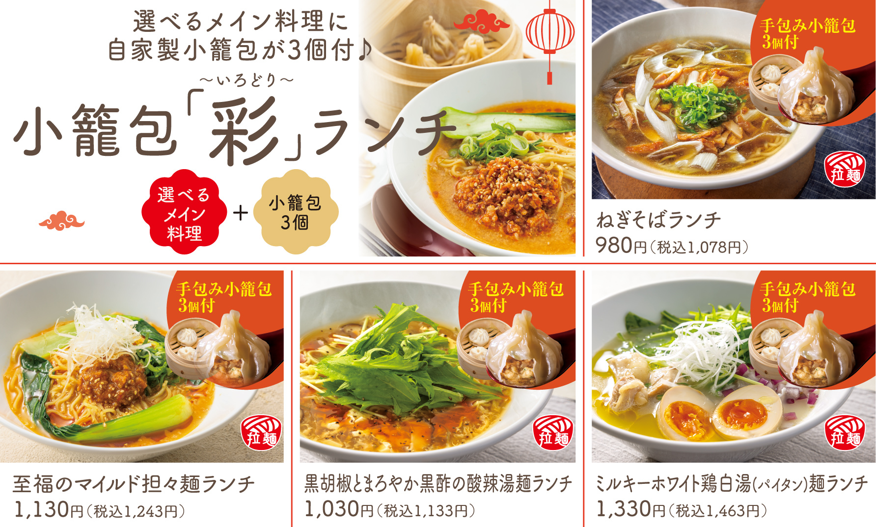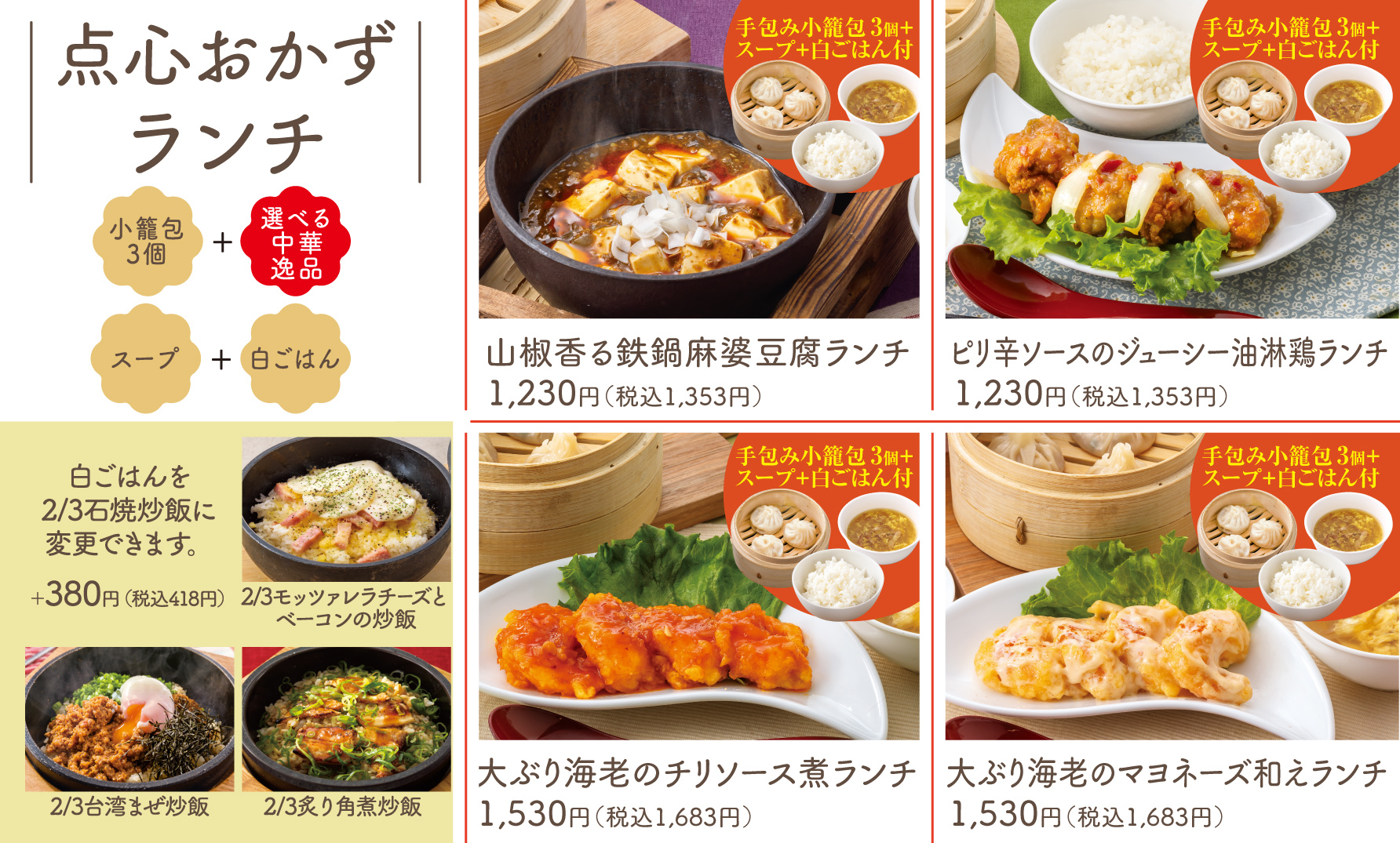 上記のグランドメニューは下記のリンクからご覧ください insert_drive_file 台湾小籠包_グランドメニュー.pdf 【平日11時~17時限定】お得なランチメニュー 平日の11時~17時限定で、炒飯・拉麵に小籠包3個がセットになったお得なランチメニューを実施中です。麻婆豆腐やエビマヨなど、定番の中華逸品のランチメニューもおすすめ!