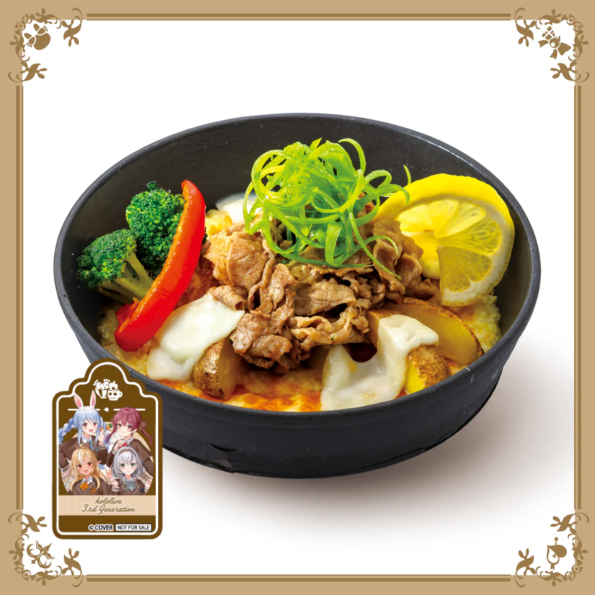 カレーにハッシュドポテトを合わせて、宝鐘マリンの“好き”なポテトやチーズをぎゅっと詰め込んだ特製ドリア!とろ~りモッツァレラチーズが絡み合う、至福の一皿です。