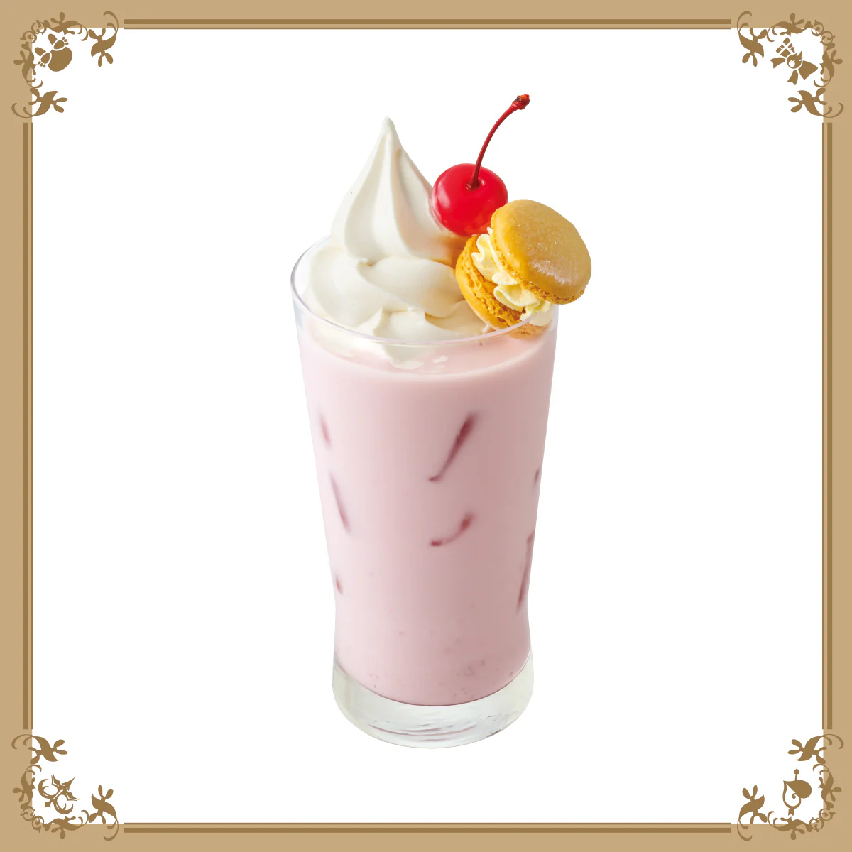 ホワイトウォーター×ミルクに苺&フランボワーズソースの甘酸っぱいドリンクです。ソフトクリームとマカロン、サクランボのトッピングで見た目もきゅるるん!
