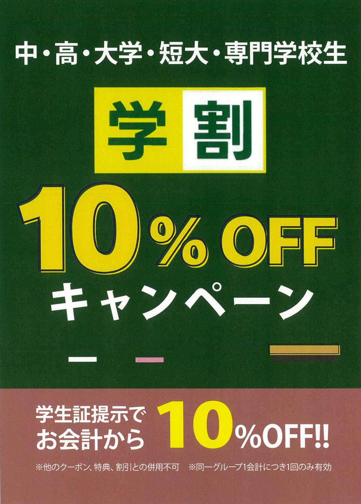 レジにて学生証をご提示いただくと、お会計から10%OFF