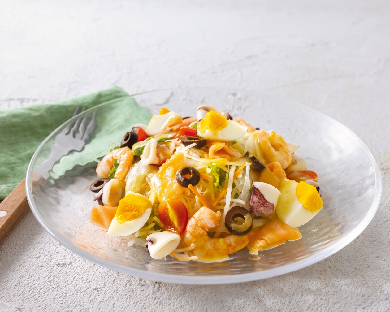 生ハムとベーコンに粉チーズを絡めた人気のサラダです。