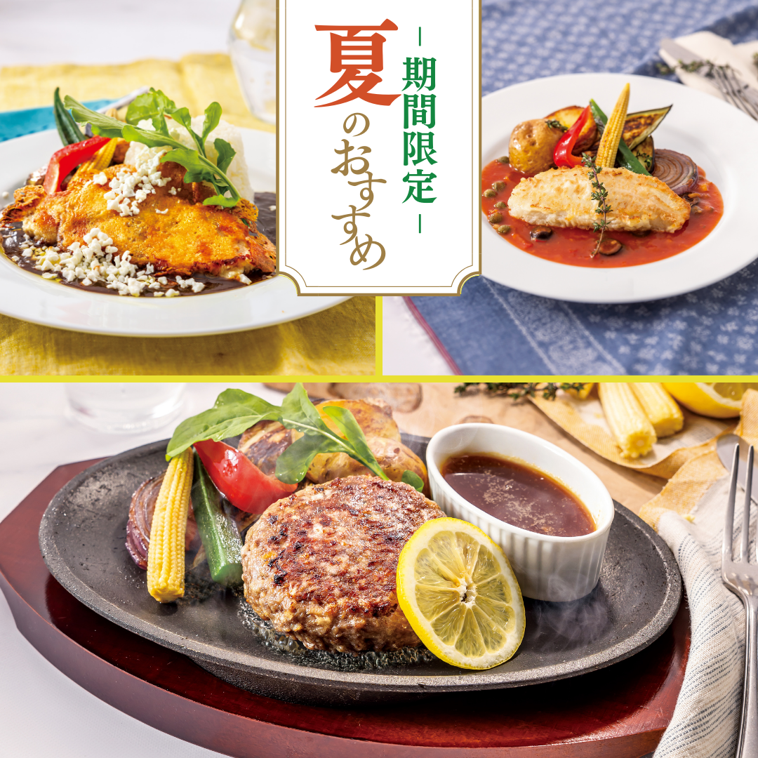丁寧に焼き上げたハンバーグと夏野菜を爽やかにレモンが香るレモンステーキソースでお楽しみください。