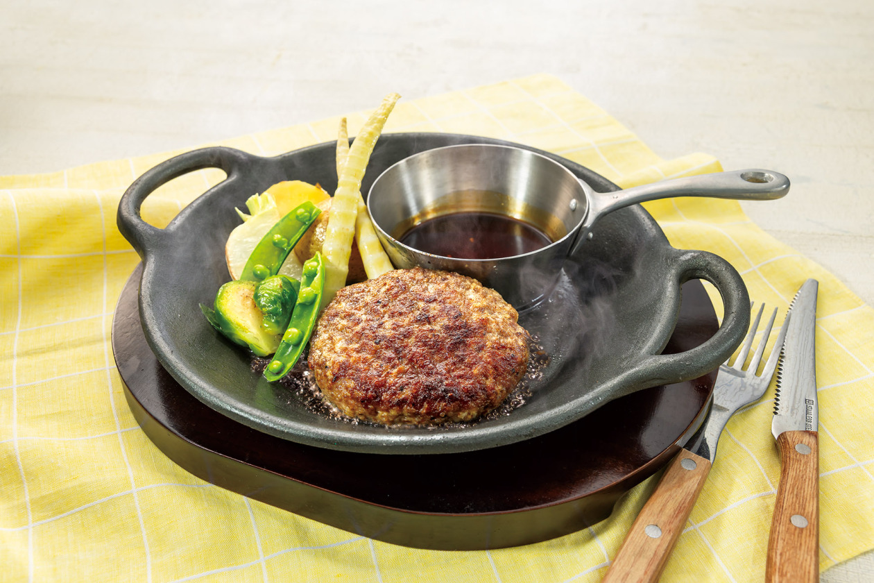 黒毛和牛100%ならではの柔らかな肉質と豊かな旨味を楽しめるハンバーグに、旬の春野菜のグリルを添えました。生姜のスパイシーな香りが立つ甘辛のジンジャーソースが食欲をかき立てる、グリル蔵敷らしい春のご馳走です。