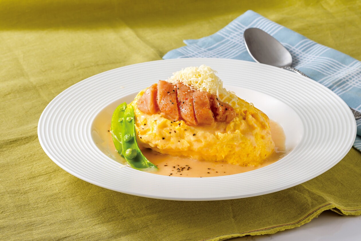 ふわとろ卵のオムライスに熟成明太子を贅沢にのせた、春限定の特別な一皿です。