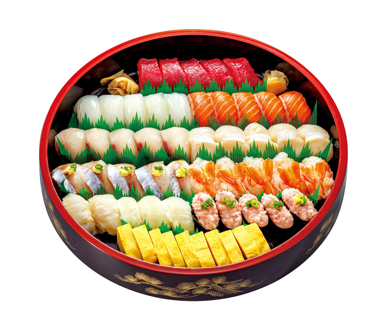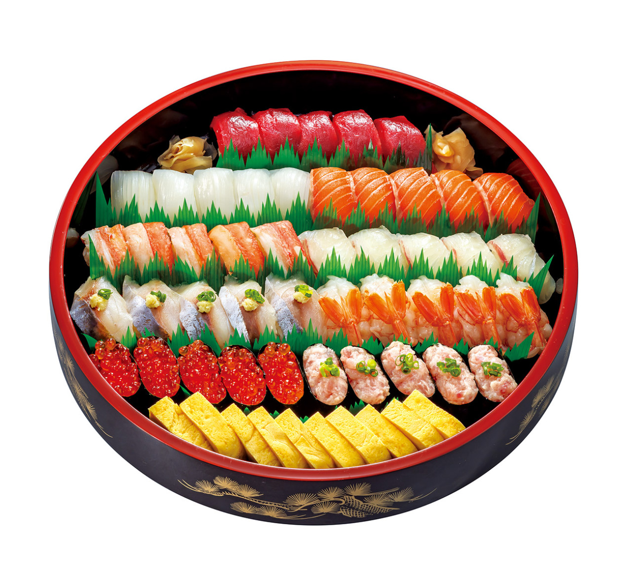 【内容】まぐろ・やりいか・サーモン・かに・白身・光物・赤えび・いくら・ねぎとろ・玉子焼き