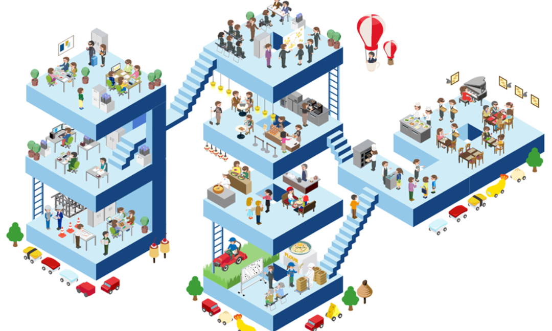 サンマルクグループの企業理念である「私たちはお客様にとって最高のひとときを創造します。」の実現に向けて、さまざまな業務に従事する従業員の方々の様子を温かみのあるイラストマップで表現しました。