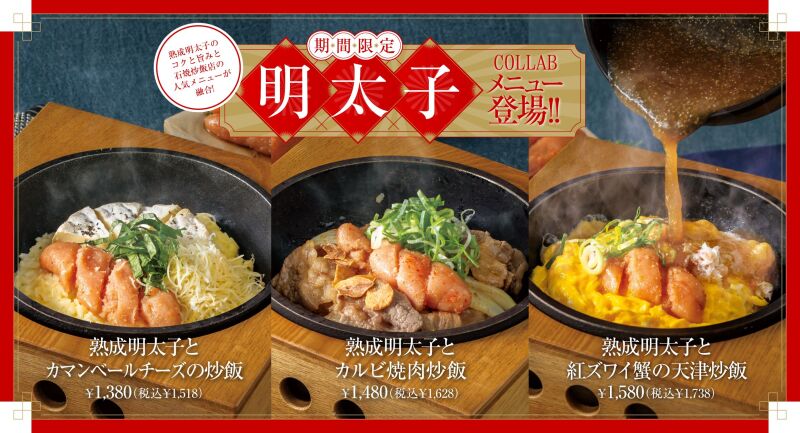 10/1(水)より、明太子メーカー「やまや」の熟成明太子を使用したコラボメニューを販売いたします!熟成明太子のコクと旨みと石焼炒飯店の人気メニューが融合した特別メニューをお楽しみくださいませ。(※流山…