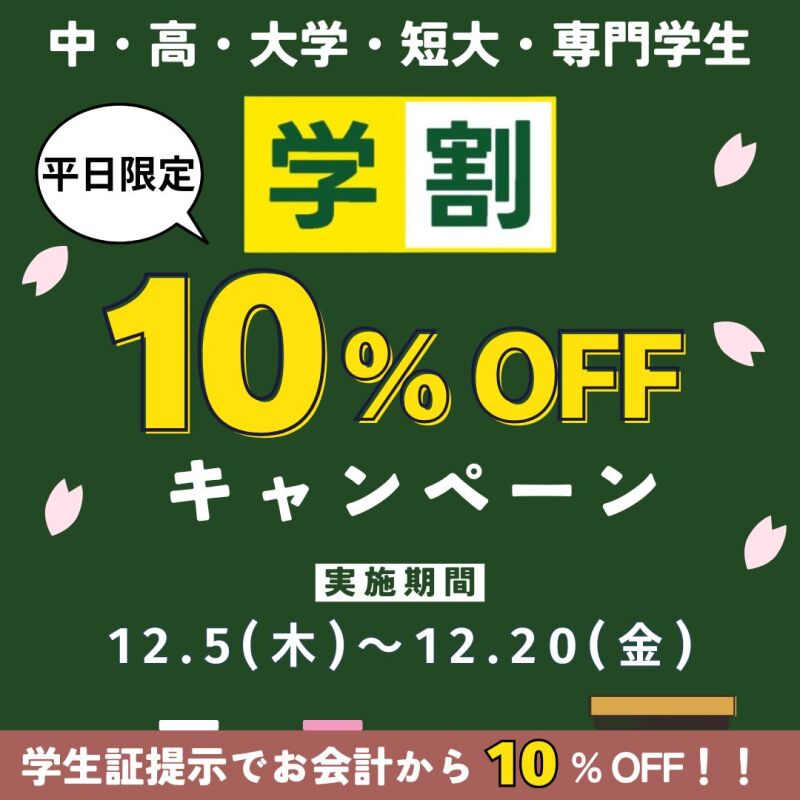 2024年12月5日(木)~12月20日(金)の期間、平日限定で【学割キャンペーン】を開催いたします!!レジにて学生証をご提示いただくと、お会計から10%OFF✨期間中は何度でもご利用いただけますので…