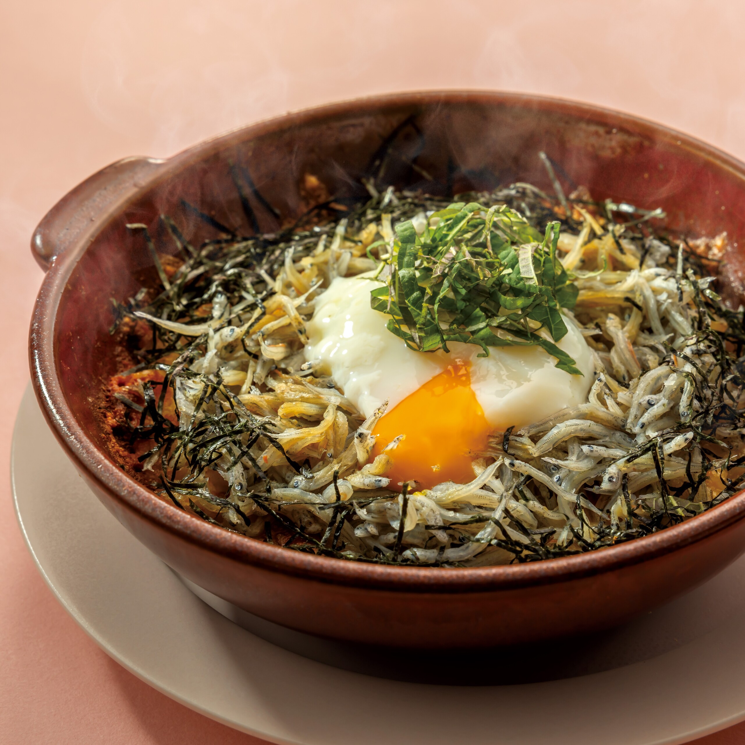 春の味覚・釜揚げしらすと温泉たまご、大葉、糸海苔の絶妙なハーモニー。