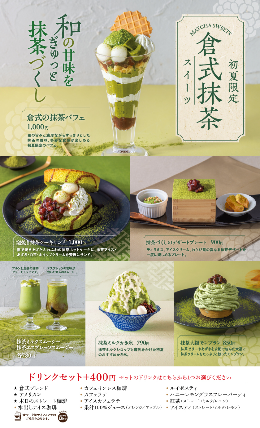 倉式珈琲店では4/20(月)より『初夏限定 倉式抹茶スイーツ』フェアを期間限定で開催いたします。