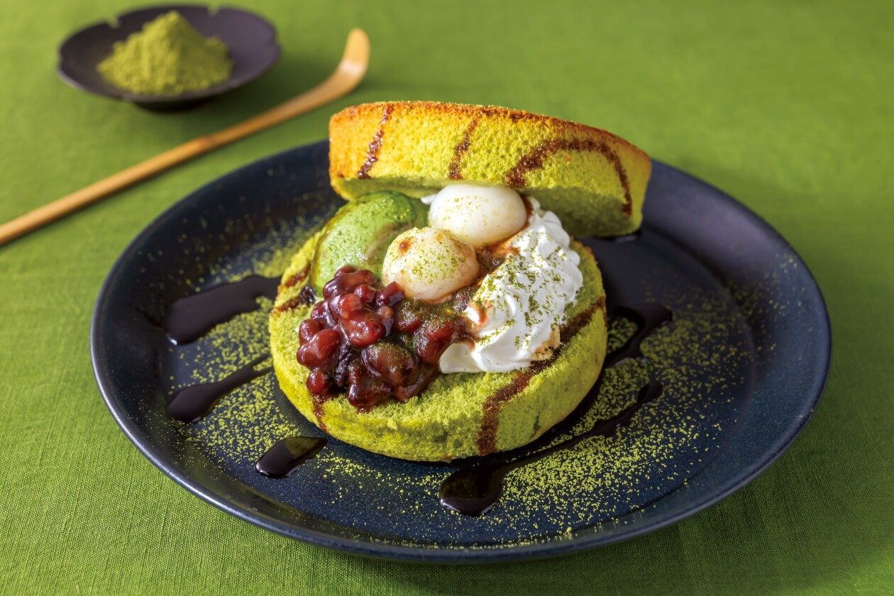 窯で焼き上げたふわふわの抹茶ホットケーキに、抹茶アイス・あずき・白玉・ホイップクリームを贅沢にサンド。