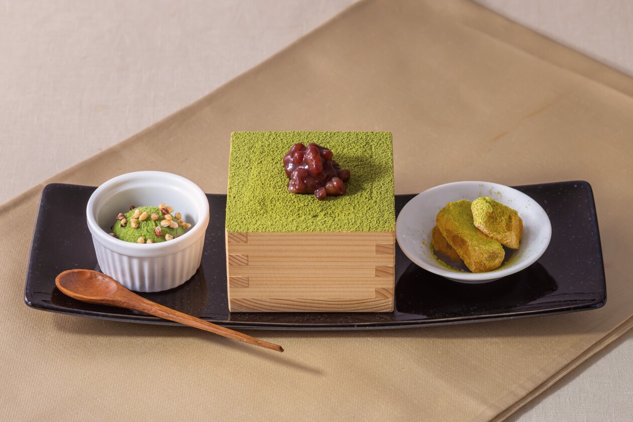 ティラミス、アイスクリーム、わらび餅の異なる抹茶デザートを一度に楽しめるプレート。