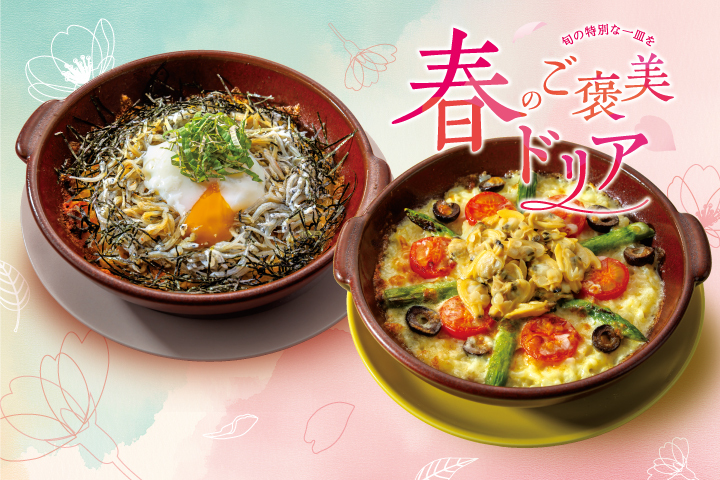 『春のご褒美ドリア』旬の素材を使用した、春限定のドリアメニュー。素材の組み合わせや味わいにこだわった、季節を感じる一皿をお楽しみください。お得なドリンクセットもご用意しております。※一部店舗では価格が…