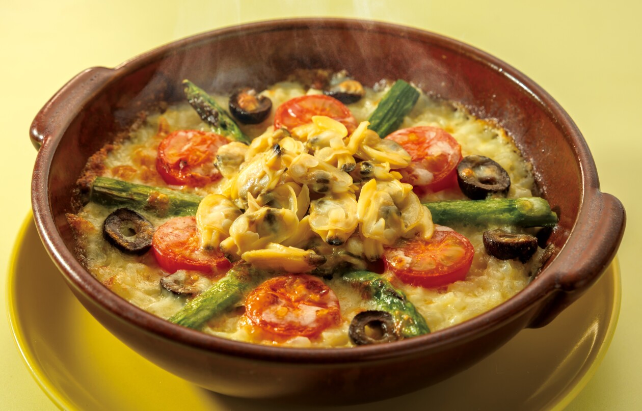 旬のアスパラとトマト、旨みたっぷりのあさりに風味豊かなブラックオリーブを添えて。ホワイトソースとチーズのまろやかな味わいです。