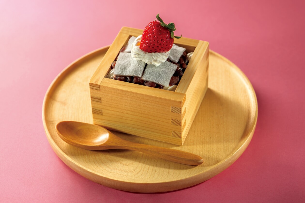 あずきをベースに、苺、求肥、ホイップクリームを重ねることで、奥行きのある味わいを演出しました。苺大福のやさしい和の味わいをミルフィーユ仕立てで楽しめる春らしさ満開の一品です。