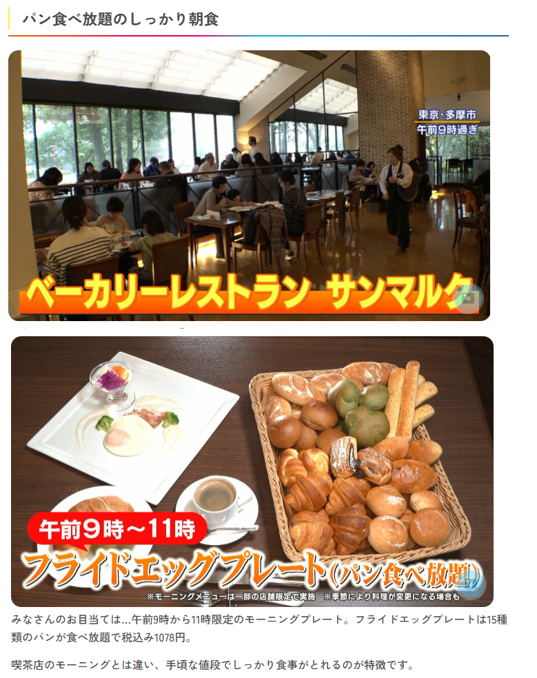 11/18(火)放送のフジテレビ サン!シャインで、半!シャイン調査班「朝外食」 のコーナー特集で、ベーカリーレストランサンマルクのモーニングメニューが紹介されました。