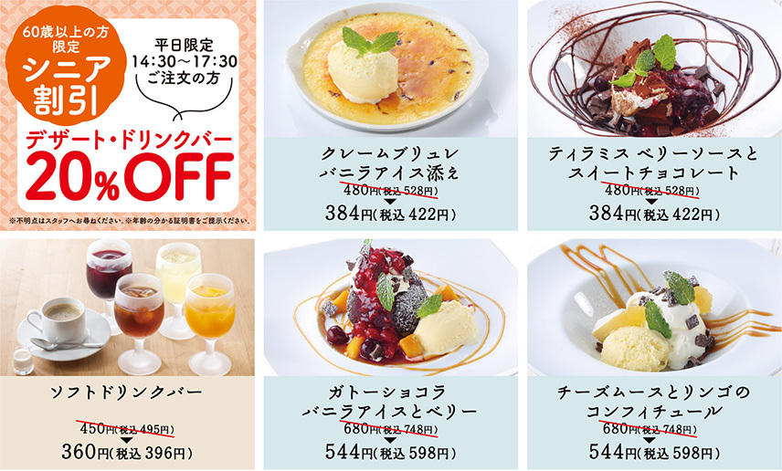 1月15日(木)~3月31日(火)まで、一部の店舗で60歳以上のお客様はデザートメニューが20%OFFになります。