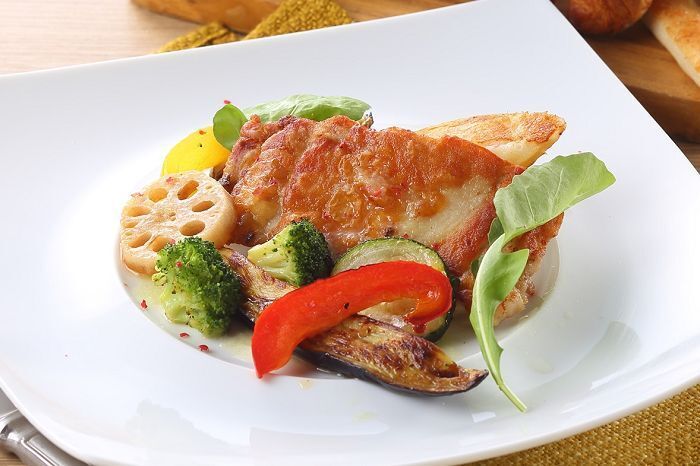 色鮮やかな野菜と若鶏のグリルが絶妙にマッチ。マスタードソースで爽やかなひとときを。