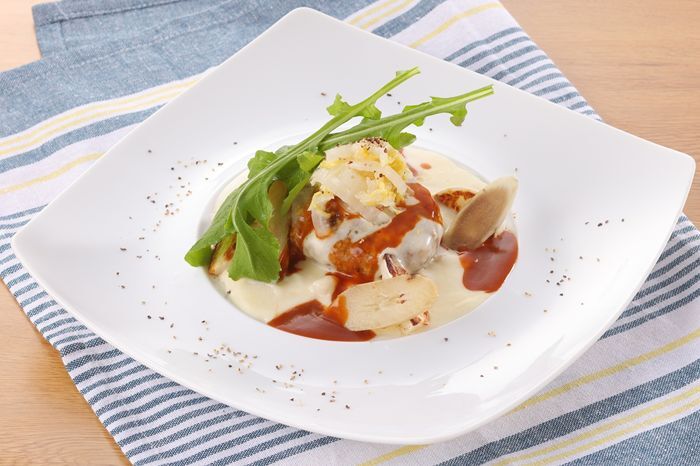 肉汁あふれるハンバーグをチーズソースで包み、トリュフとイセエビの特製ソースで仕上げました。
