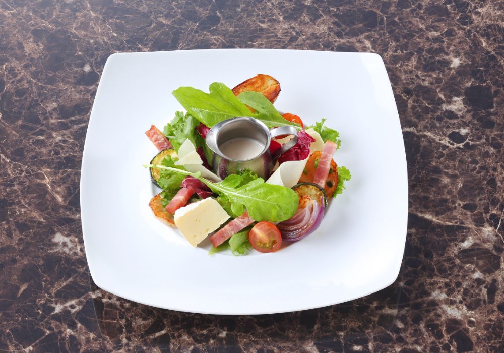 ベーコンのロティと濃厚なカマンベールチーズが絶妙にマッチした贅沢なサラダ。ワインとともに楽しむひとときをどうぞ。