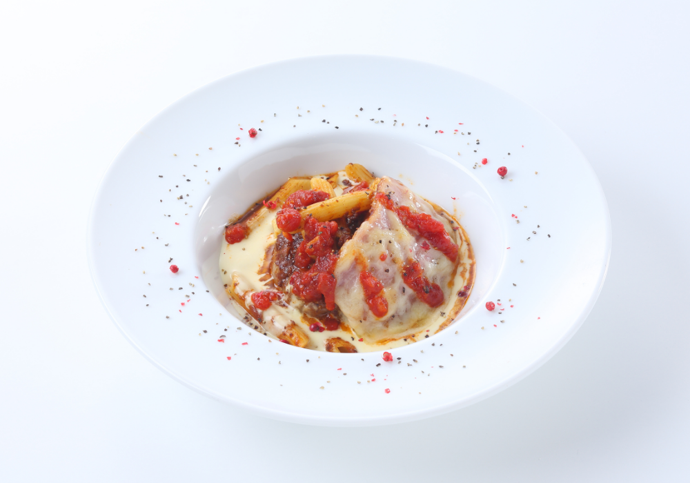 チキンのロティとペンネリガーテのクリームグラタン トリュフの香り