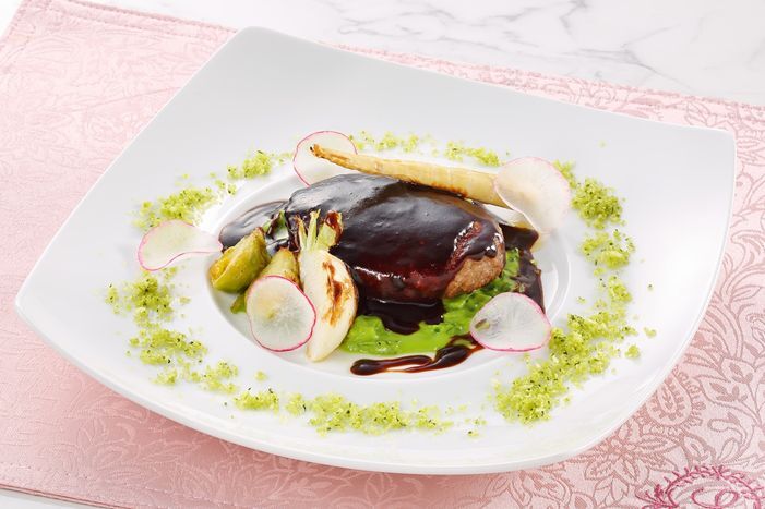 肉汁あふれるハンバーグをチーズソースで包み、トリュフとイセエビの特製ソースで仕上げました。