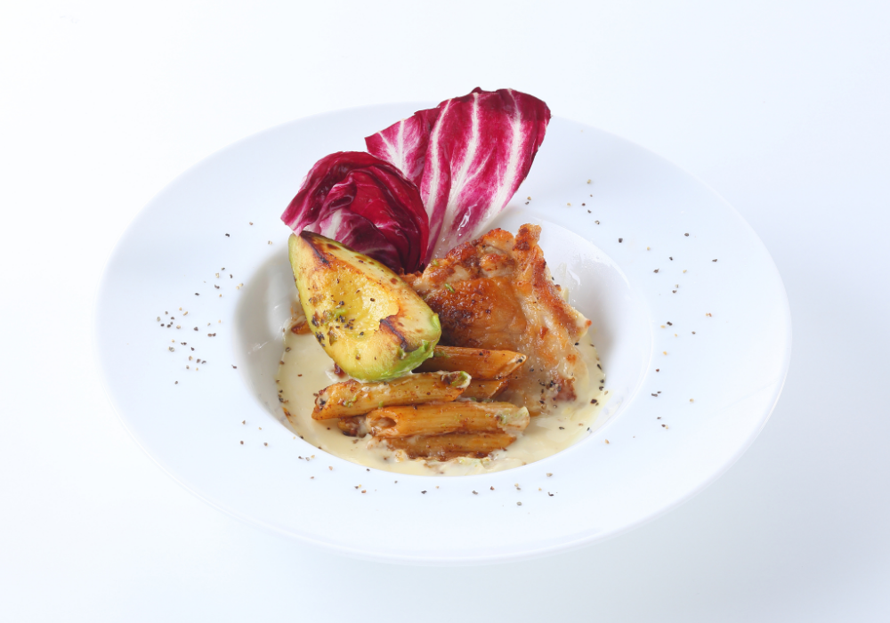 若鶏とアボカドをチーズソースで仕上げた、濃厚でクリーミーな一皿。口いっぱいに広がるリッチな味わいです。