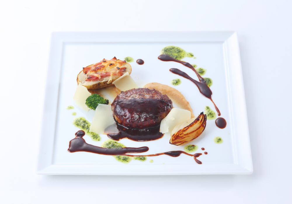 グラタン風のじゃがいもをハンバーグに添え、濃厚なデミグラスソースとバジルソースで仕上げました。