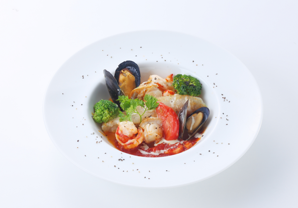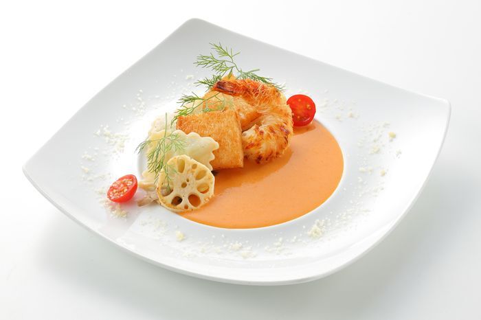 舌平目とブラックタイガーの旨味にイセエビソースと酸味のあるトマトソースが絡み合う贅沢な一皿です。