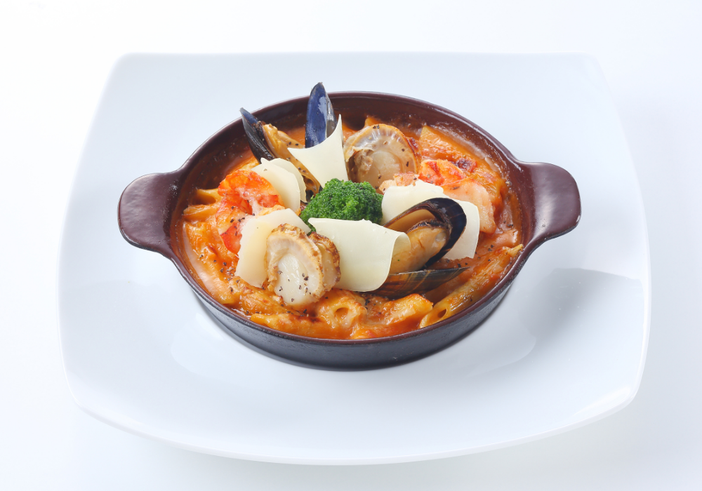 シーフードとイセエビソースのペンネリガーテグラタン デュガスチーズ添え