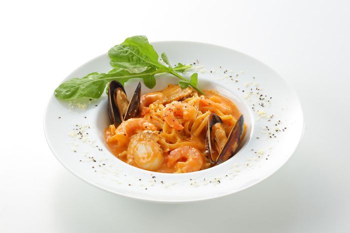 帆立・ムール貝・えびと、濃厚なイセエビソースをリングイネパスタにまとわせました。