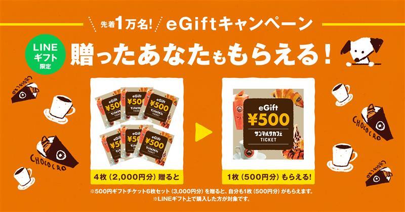 期間中にサンマルクカフェのギフトチケット500円×6枚を友だちに贈ると、ギフトチケット500円がもらえます。
