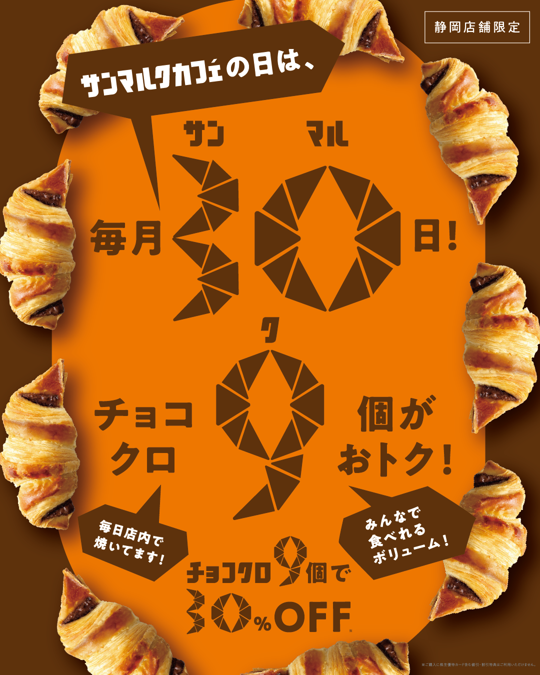 “30日はサンマルクカフェの日”と題して、サンマルクカフェ定番商品の「チョコクロ」9個入りが30%オフになる特別企画が静岡店舗限定で始動。11月30日(日)に初開催いたします。