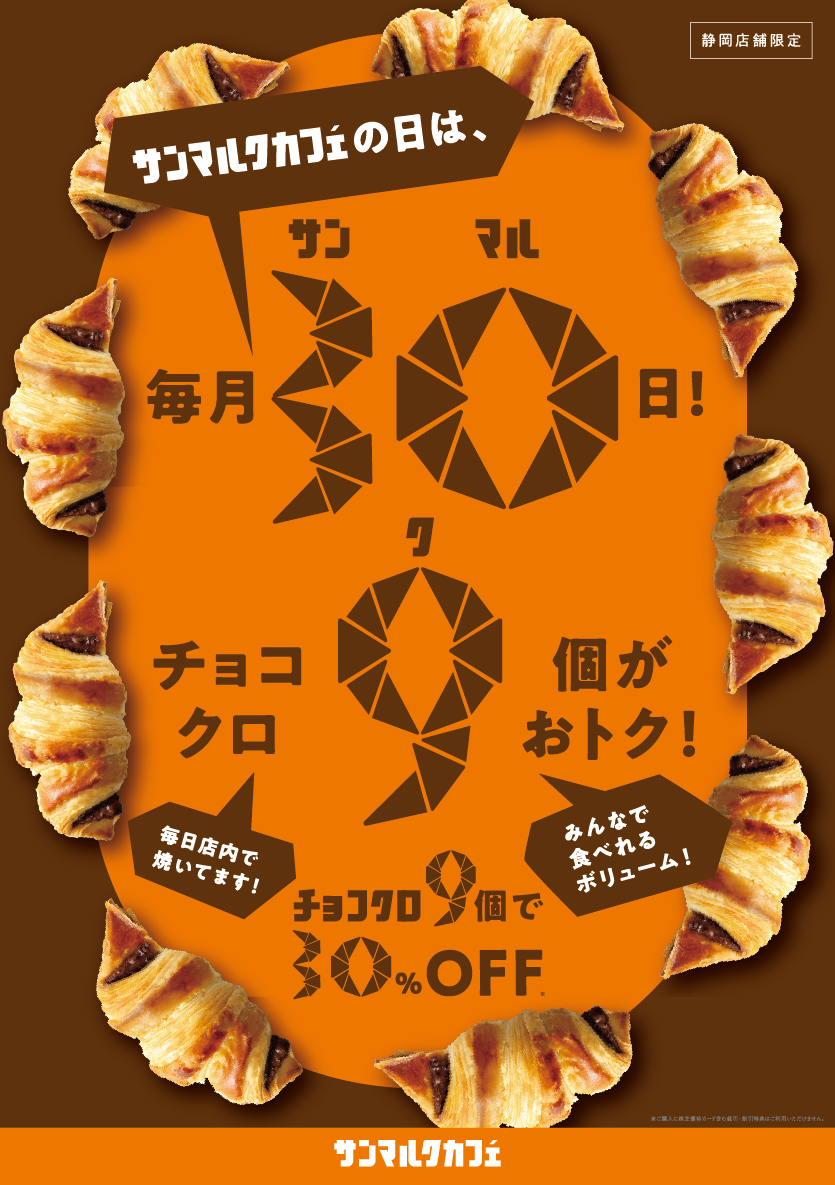 “毎月30日はサンマルクカフェの日”と題して、サンマルクカフェ定番商品の「チョコクロ」9個入りが30%オフになる特別企画が静岡店舗限定で始動。