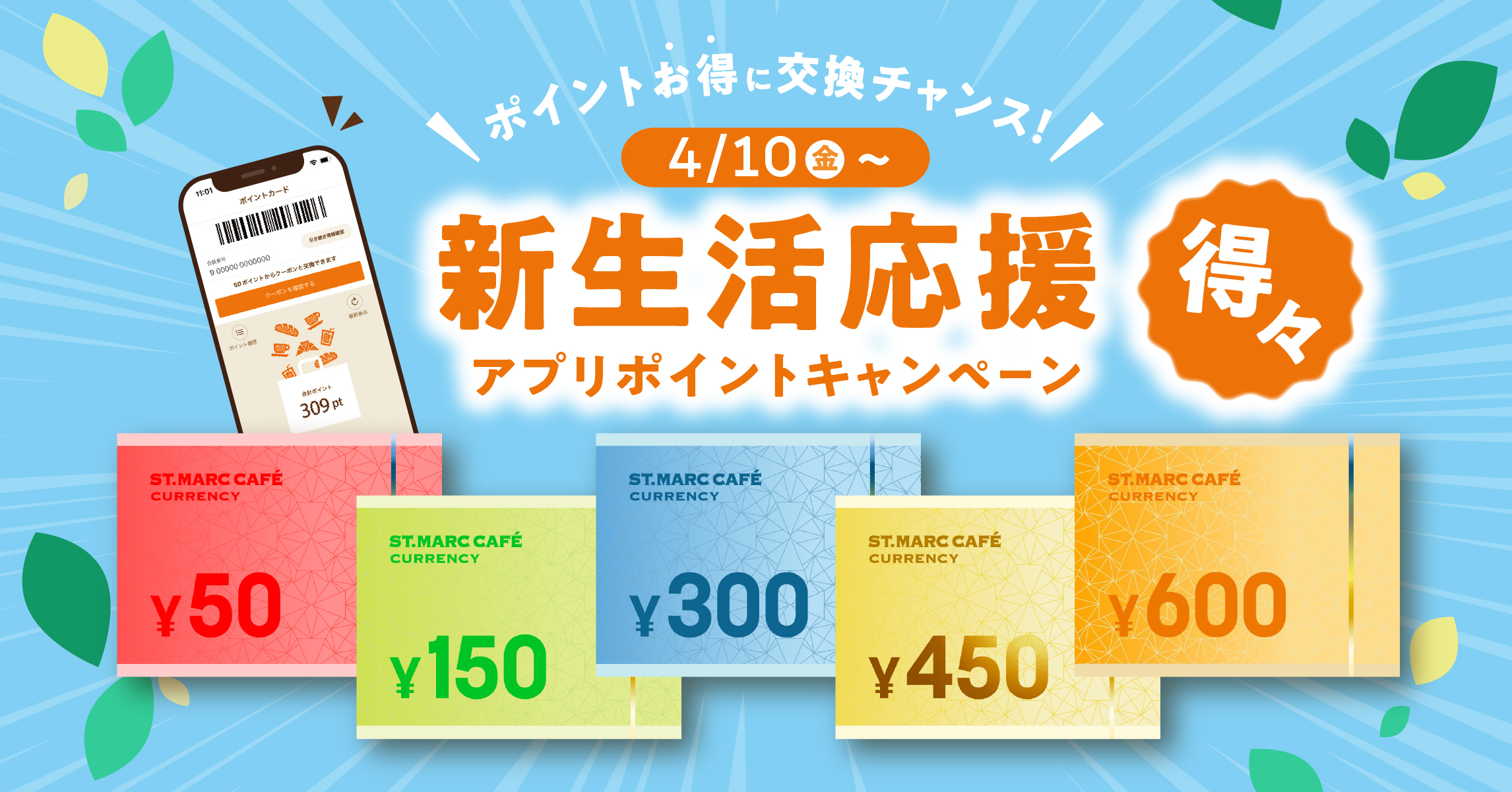 4月10日(金)よりサンマルクカフェ公式アプリ内のアプリポイントが、よりお得にクーポンへ交換できる「新生活応援 アプリポイント得々キャンペーン」を開始します。期間中は、通常50ポイントからのところ、25ポイントから交換できる期間限定クーポンや、150ポイントで交換できる600円オフクーポンが登場します。さらに、いつものクーポンの還元率もアップ!この機会にぜひアプリクーポンをご利用ください。