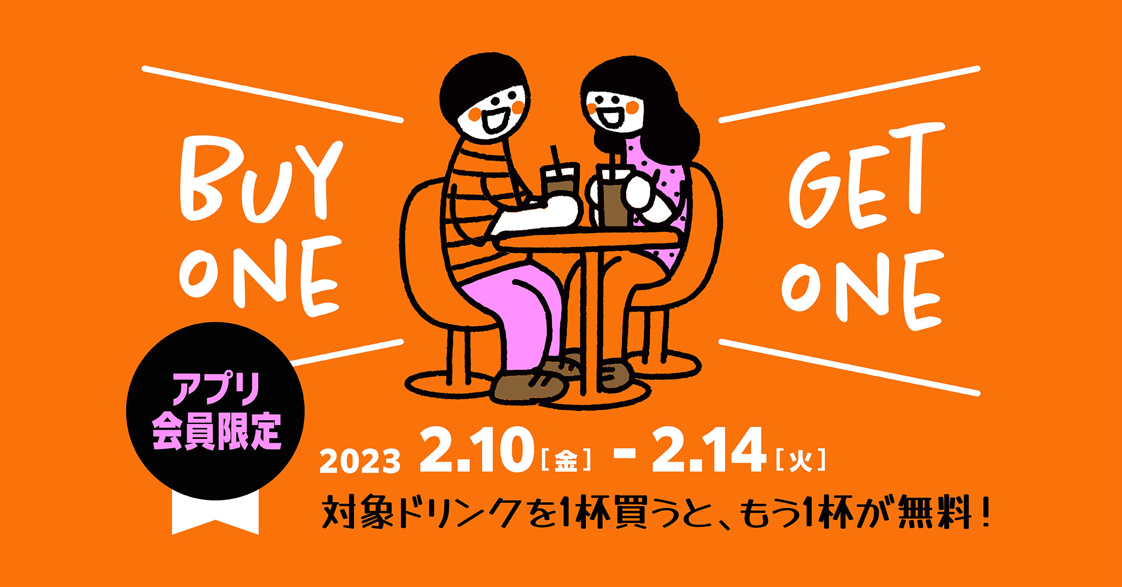 対象商品を1杯ご購入頂くと、ご購入商品と同じドリンクをもう一杯ご提供する『バレンタイン Buy One Get One』クーポンをアプリ会員様向けにキャンペーン期間中毎日配信いたします。