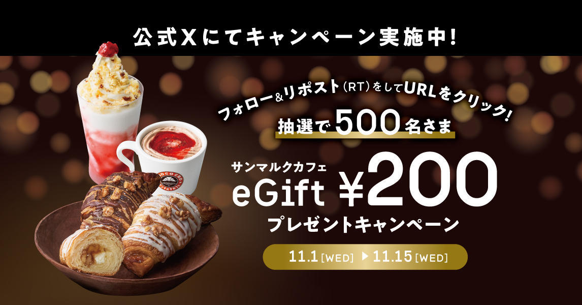 公式Xにて、200円分のサンマルクカフェデジタルギフト(eGift)が抽選で500名さまに当たるキャンペーンを実施します🎁